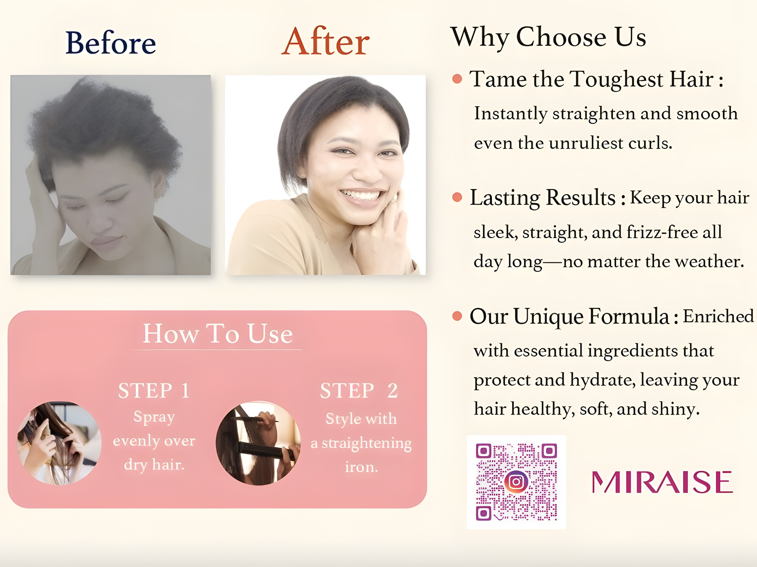 All over the world, people struggle with frizzy, unruly hair and struggle to maintain their desired hair style, particularly in regions with high heat or humidity. This leave-in conditioner has a unique ability to maintain hair shape even in hot and humid environments, strengthening the hair’s internal structure, preventing breakage and split ends, and keeping hair straight and beautiful for a long time.